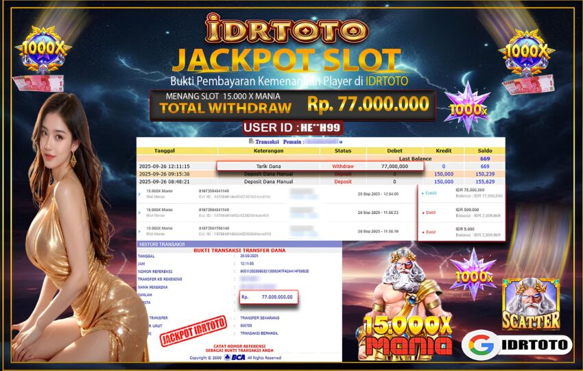 IDRTOTO BAYAR LUNAS JACKPOT PERMAINAN SLOT 15.000 X MANIA Rp.77.000.000 – LUNAS
