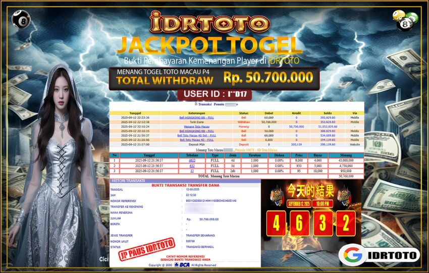 IDRTOTO BAYAR LUNAS JACKPOT PERMAINAN TOGEL TOTO MACAU P4 Rp.50.700.000 – LUNAS